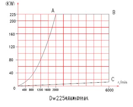 2.特性曲線 DW系列電渦流測(cè)功機(jī)特性曲線表示測(cè)功機(jī)在不同轉(zhuǎn)速下所能吸收的功率范圍,它由OABC組成。 OA—最大扭矩線。當(dāng)最大扭矩為常數(shù)時(shí)所能吸收的最大功率,隨著轉(zhuǎn)速的增加而上升,在A點(diǎn)達(dá)到扭矩強(qiáng)度所允許的最大功率。 AB—最大功率線。測(cè)功機(jī)達(dá)到最大扭矩點(diǎn)(A)后,隨著轉(zhuǎn)速的變化測(cè)功機(jī)所允許吸收的最大功率。 BC—最高轉(zhuǎn)速線。測(cè)功機(jī)在工作時(shí)允許的最高轉(zhuǎn)速。 上述三段限線所包圍的區(qū)域?yàn)闇y(cè)功機(jī)的工作范圍。凡動(dòng)力機(jī)或其它機(jī)械設(shè)備的動(dòng)力特性在OABC所包圍的范圍內(nèi)者,均能用該型測(cè)功機(jī)進(jìn)行特性試驗(yàn),用戶在選用測(cè)功機(jī)時(shí)須稍留有余地。但余地太大,測(cè)試精度則難以保證。 或由OABCD組成,則AB線為主軸強(qiáng)度所容許的最大扭矩值,其余BC、CD線含意同上。
